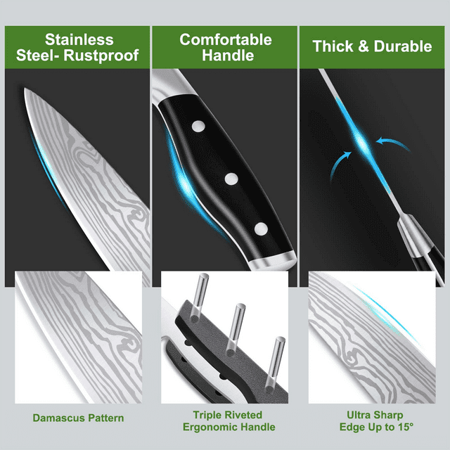 Multi-purpose kitchen knife set: 23 pcs setincludes chef's knife, santoku knife, bread knife, slicing knife, utility knife, paring knife, boning knife, boning knife, 8packs steak knives, sharpener rod, kitchen shears, finger guard, and other accessories. This knife set can be used for your daily kitchen tasks and fit all your needs.