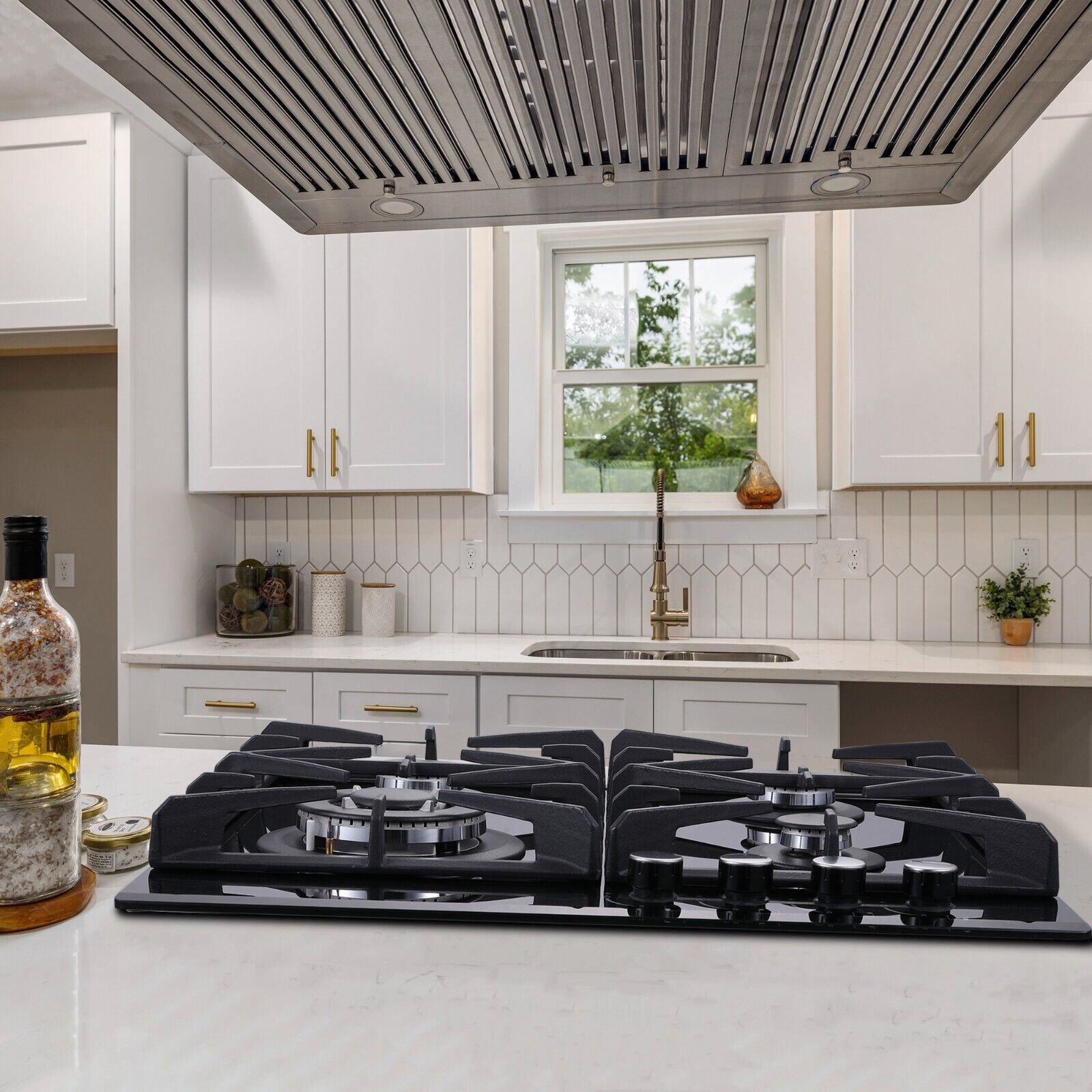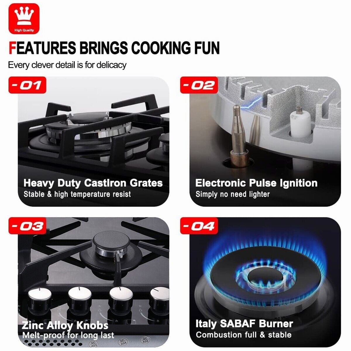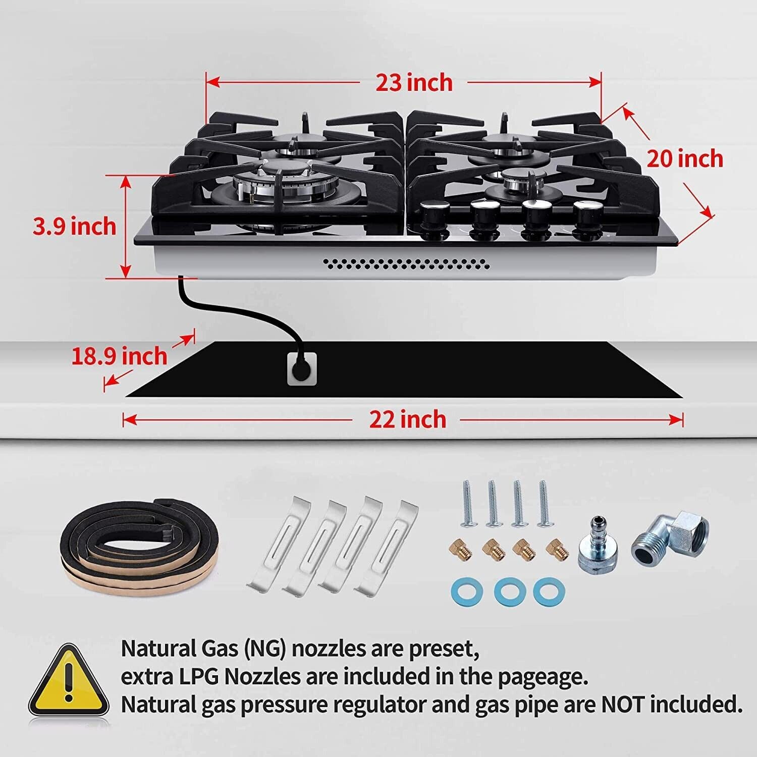 Gas Cooktop 24 inch Black Tempered Glass 4 Burners Built-in Hob NG/LPG Convertible