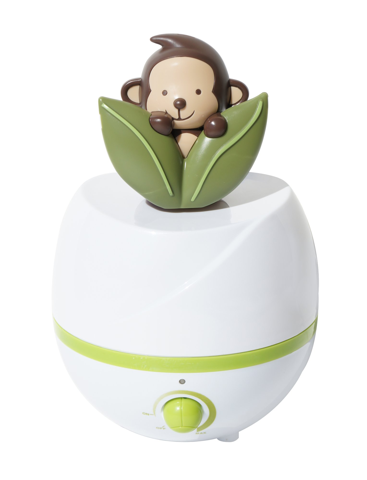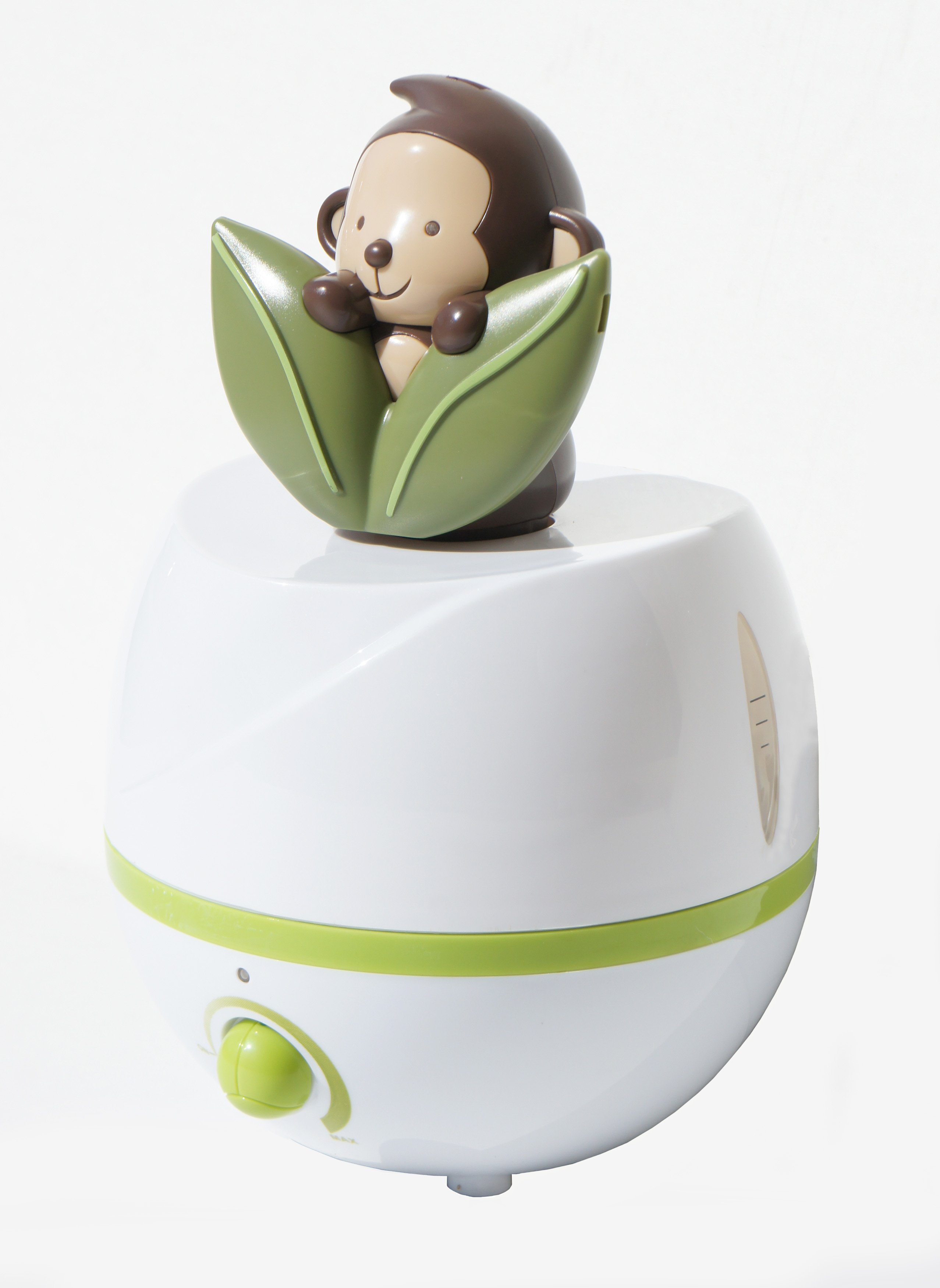Help your little ones breathe easier by adding moisture to the air with our adorable Monkey humidifier. Provides year-round relief from the drying effects of AC and Heater. Features super-quiet operation, 2.5 liters tank capacity and auto shut-off protection (with no audible alarm). 360-degree directional nozzle and 3 misting outlets (top, left and right) provide moisture through out the room. This adorable peek-a-boo monkey will add charm and functionality to any child’s room. Features and Functions · Cool mist (ultrasonic technology) · High humidity output · Silent operation · Adjustable mist intensity · 3 misting outlets (top, left and right) · Auto shut-off protection · Easy fill water tank with water level indicator · 2.5 liters tank capacity · Designed for rooms up to 450 sq. ft. · No-slip feet · Adorable design · ETL Specifications Input voltage 120V / 60Hz Power consumption 23W Water tank capacity 2.5 liters Color green / white Unit dimensions 8.75 x 8.75 x 13(H) inches Shipping dimensions 12 x 12 x 10 inches Net weight 2 lbs Shipping weight 4 lbs