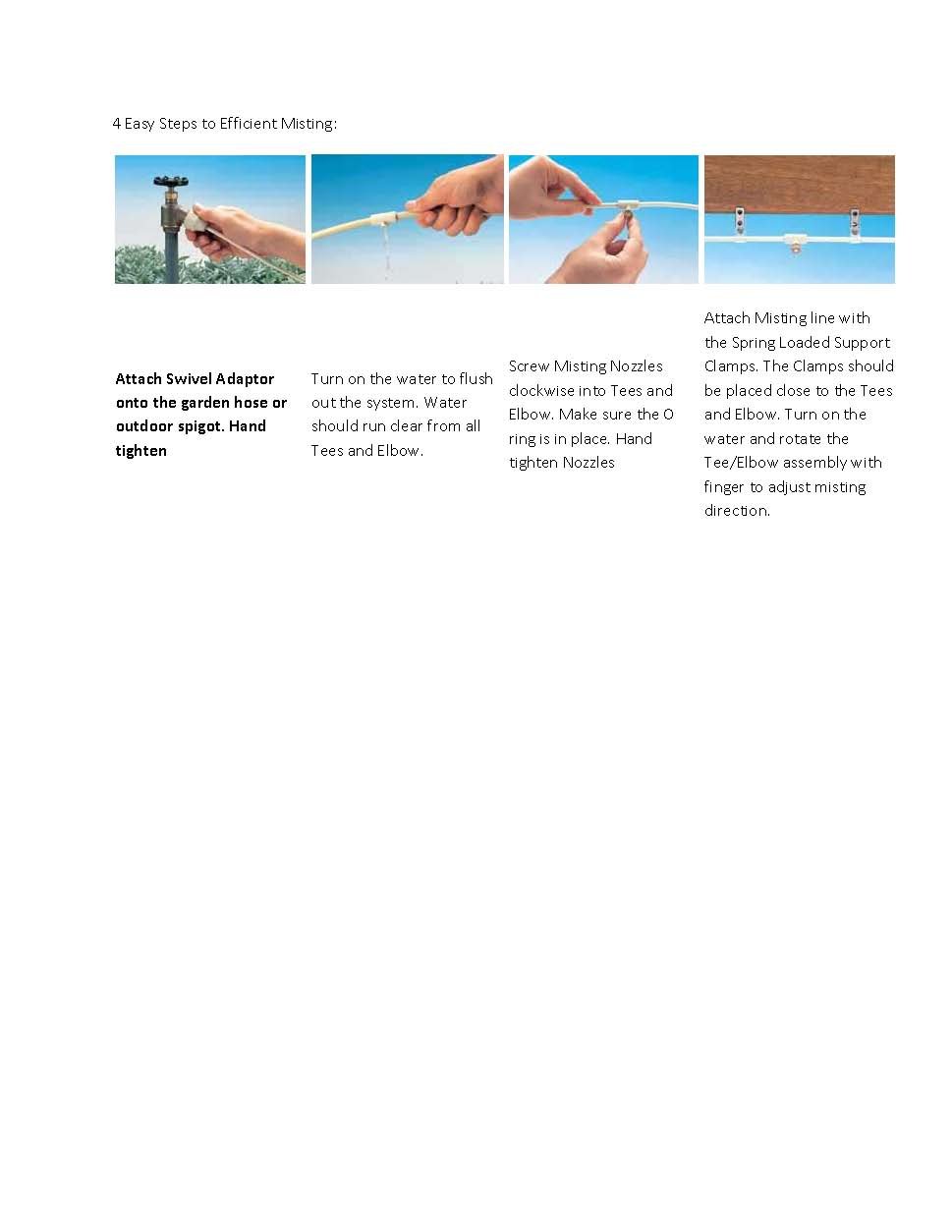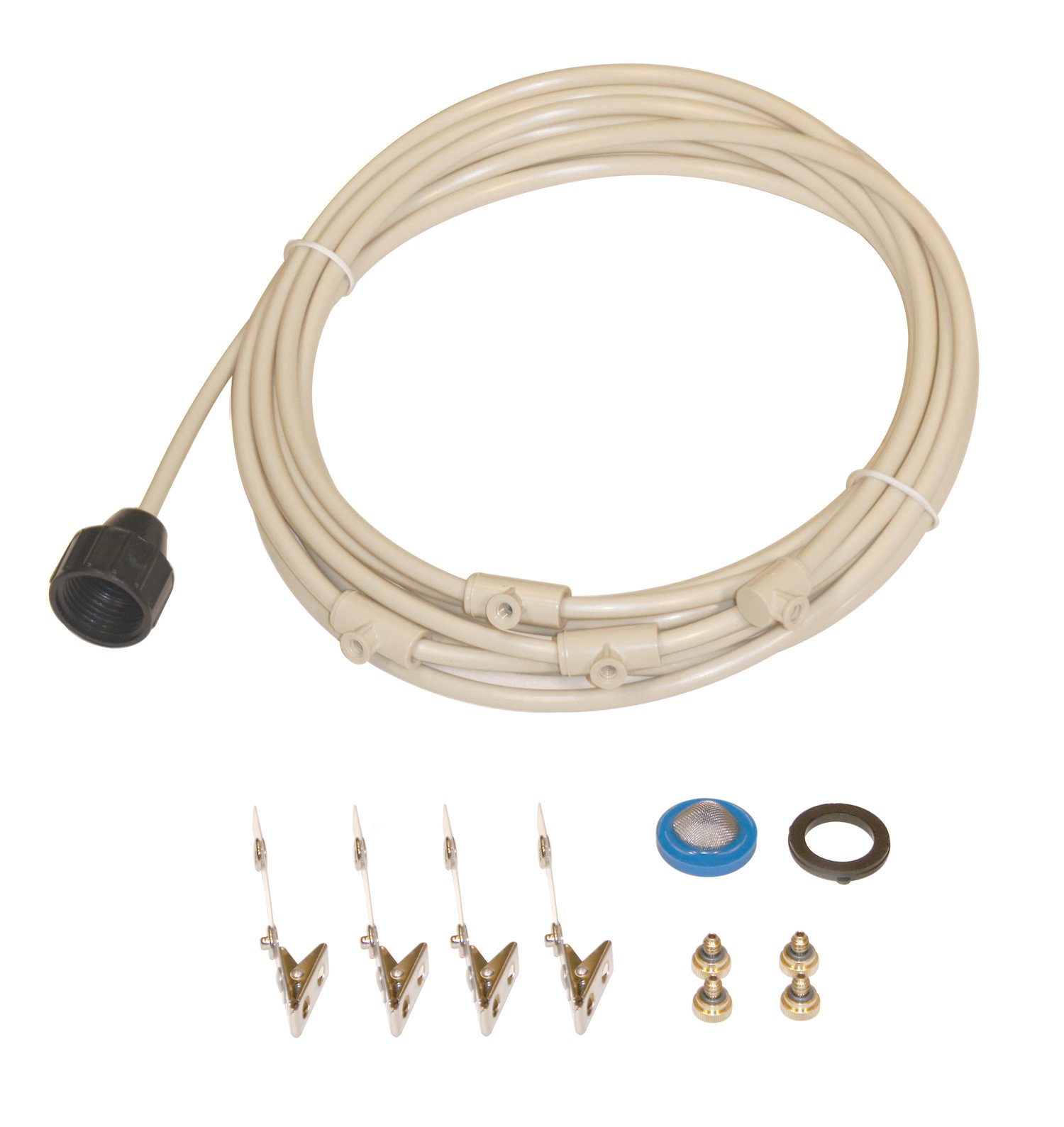 Cool off your outdoor living area with this Do-It-Yourself Misting Kit. This high quality pre-assembled system comes complete with 4 brass nozzles that deliver a continuous stream of ultra-fine mist, which can cool the ambient temperature up to 25°F. Features · Reduces temperature up to 25°F · Connects to your standard faucet/spigot · Premium brass nozzles that are rust free and more resistant to calcium deposits · High quality UV-resistant material · Cools patios, play and pet areas · Clears airborne particles and repels flying insects · Easy to install · Fully expandable · Helps humidify during the dry season · Coverage area: approximately 15 sq.ft. per nozzle · Made in the USA Contents: · 1/4″ Hose (18-foot) x 1 · Spigot/Garden Hose Adaptor & Filter Washer x 1 · 1/4″ Nozzle Tees x 3 · 1/4″ Nozzle Elbow x 1 · Premium Brass Misting Nozzles x 4 · Spring-Loaded Clamps x 4 4 Easy Steps to Efficient Misting:\ Attach Swivel Adaptor onto the garden hose or outdoor spigot. Hand tighten Turn on the water to flush out the system. Water should run clear from all Tees and Elbow. Screw Misting Nozzles clockwise into Tees and Elbow. Make sure the O ring is in place. Hand tighten Nozzles Attach Misting line with the Spring Loaded Support Clamps. The Clamps should be placed close to the Tees and Elbow. Turn on the water and rotate the Tee/Elbow assembly with finger to adjust misting direction.