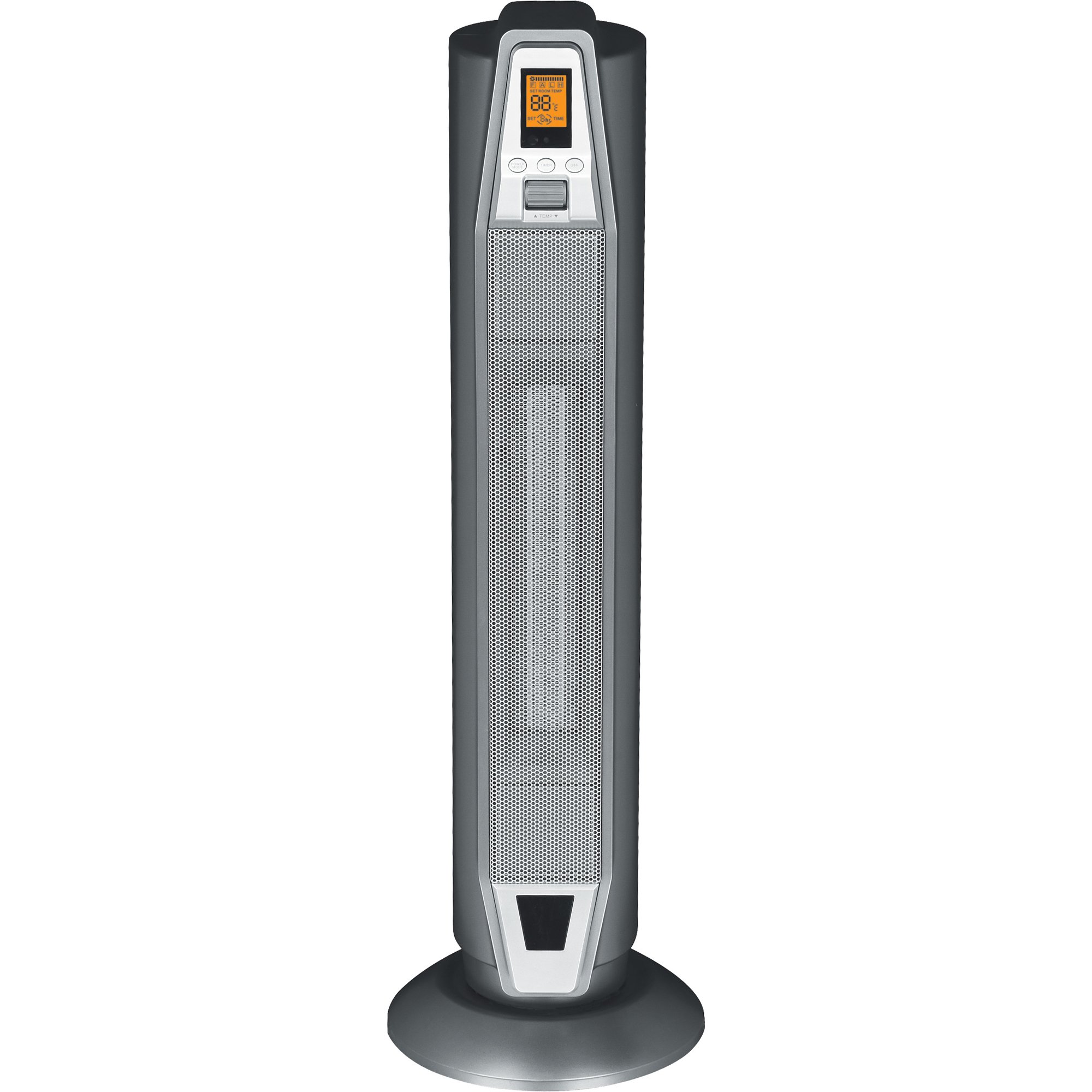 Ceramic heat offers soothing warmth and the safety of a low surface temperature. Oscillating unit provides widespread heat coverage to gradually warm your entire room. Choose from 4 settings: high heat, low heat, auto heat and fan. Features digital thermostat with LCD display and remote, timer and removeable filter. Elegant standing design will compliment any room. Features and Functions – Digital thermostat (50°F to 86°F) with LCD display – OFF timer, up to 8 hours – Removeable air filter – Remote control – Doubles as a fan – LCD displays ambient room temperature – Oscillation – 4 settings: High Heat, Low Heat, Auto Heat and Fan – Thermo cut-off protection – Ceramic heating element – Tip over safety switch – ETL Specifications Input voltage 120V / 60Hz Power consumption Fan – 25W Low heat = 900W High heat = 1500W Auto = 1500W Temperature setting 50 ~ 86 °F (Auto mode) Safety Thermal cut-off / Tip over safety switch Timer 8 hours Cord length 70 inches Unit dimension (H x Diameter) 28.5 x 9 in Package dimension (W x D x H) 10.25 x 9.85 x 29.75 in Net / Gross weight 9 / 11 lbs