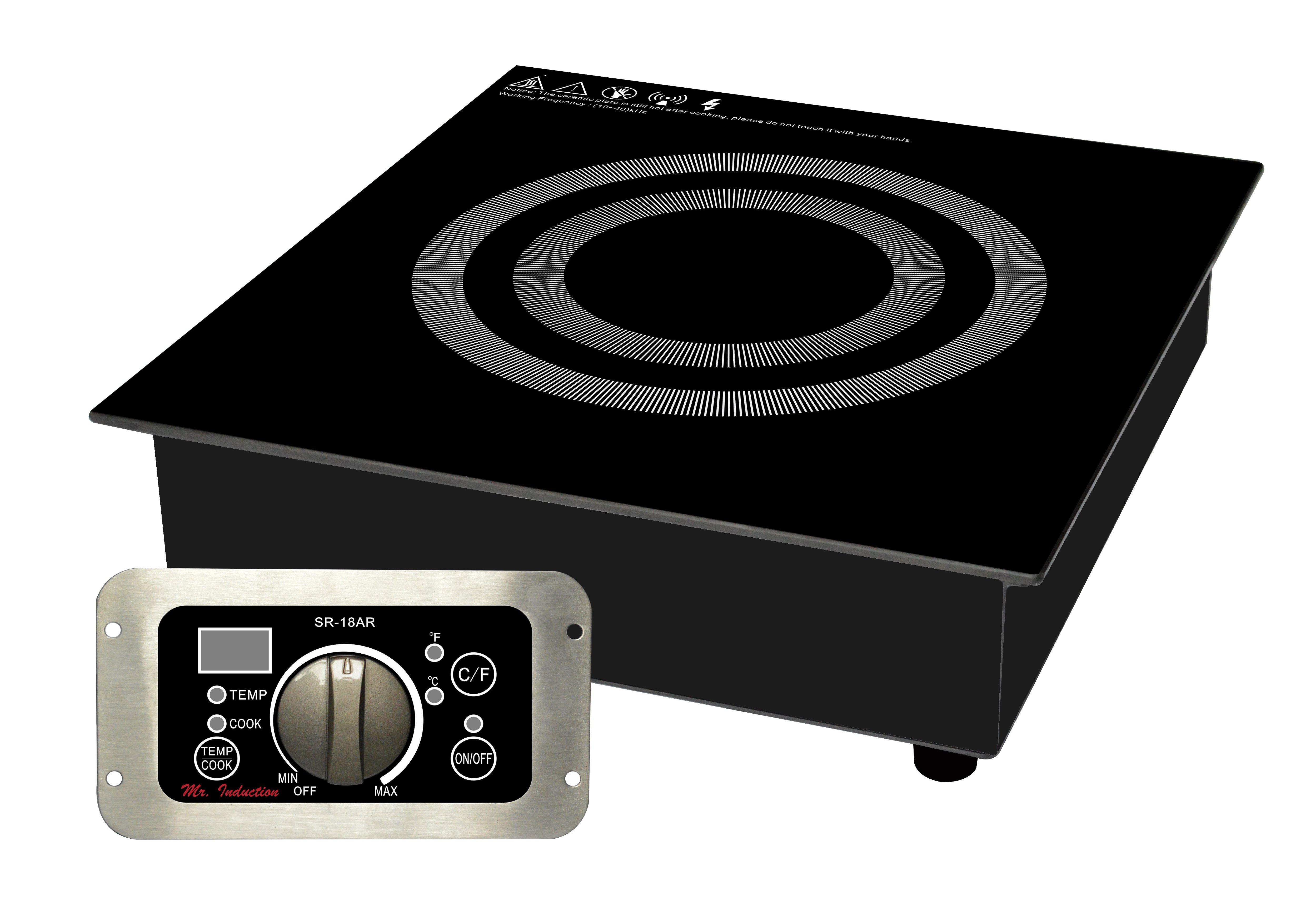 Customize your food service facility and revolutionize your food preparation with the most advanced 1800W commercial induction equipment available. Ideal for demonstration cooking, suite service, catering and buffets. Available in two power levels. Features SmartScan™ enhancement and COOK and TEMP modes. Separate control for remote mounting. Features: · Built-in or countertop application · SmartScan® technology: voltage, pan size and type recognition · 5mm thick tempered glass cooktop · Choice of power or temperature mode · Power mode: 1-20 levels (350-1800W) · Temperature mode: 90-440°F (in 20°F increments, except 170-180/260-270/350-360°F) · Large LED power/temp display · Displays in °F or °C · Simple knob-set thermostat control · Touch-sensitive control box with stainless steel frame · Power ON/OFF touch pad with indicator light · Cook & Temp mode indicator lights · Over or under voltage protection · FCC / CETL / ETL-Sanitation to NSF-4 Construction: · Built-in range with installation-ready modular flanged base · Separate control panel with 40″ cable for easy front mounting · 100% silicon rubber protective top seal · 6′ power cord length Specifications Input voltage 120 / 60Hz Phase 1 Power consumption 1800W / 16A Plug NEMA 5-15P Receptacle NEMA 5-15R Temperature range 90 – 440°F Cord length 4.4 ft Unit dimension (W x D x H) 12.56 x 13.38 x 3.94 in. Package dimension (W x D x H) 15.6 x 19.3 x 6.9 in. Net weight 13.34 lbs Gross weight 15 lbs