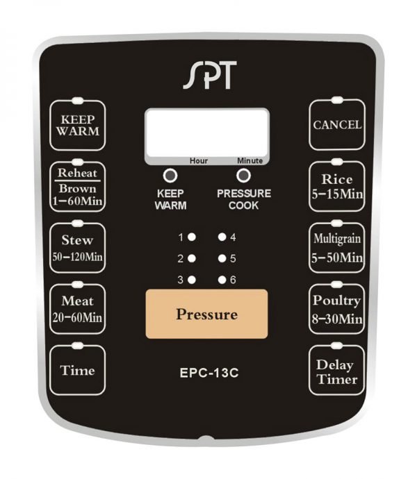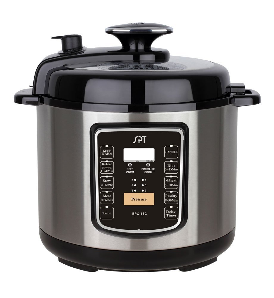 Newly designed EPC-13C features a Quick Release button, 6 pre-set programs and 6 adjustable pressure levels. Reduce time spent in the kitchen with help of this 6.5-quart Electric Pressure Cooker. 6 programs include: Rice, Multigrain, Poultry, Meat, Stew and Reheat/Brown. Up to 24 hours Delay Start Timer allows you to prepare the food and have it ready at a later time. Optional Keep-Warm mode holds the temperature of the food until ready to eat. Safety lid lock prevents accidental opening when pressurized. Equipped with a durable stainless steel inner pot with no coatings and an attractive stainless steel exterior.