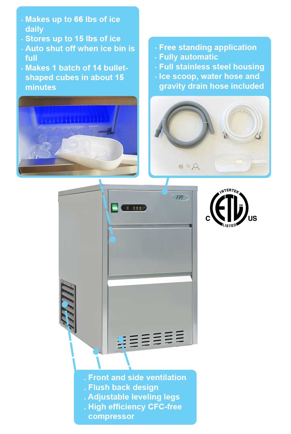 – Ice scoop, water hose and gravity drain hose included