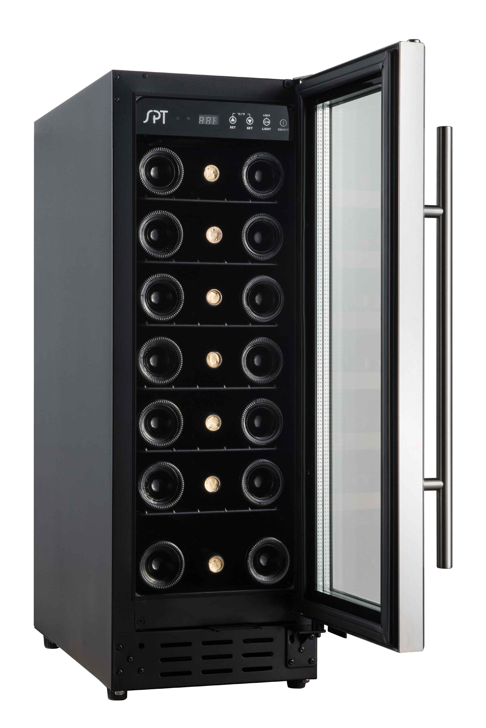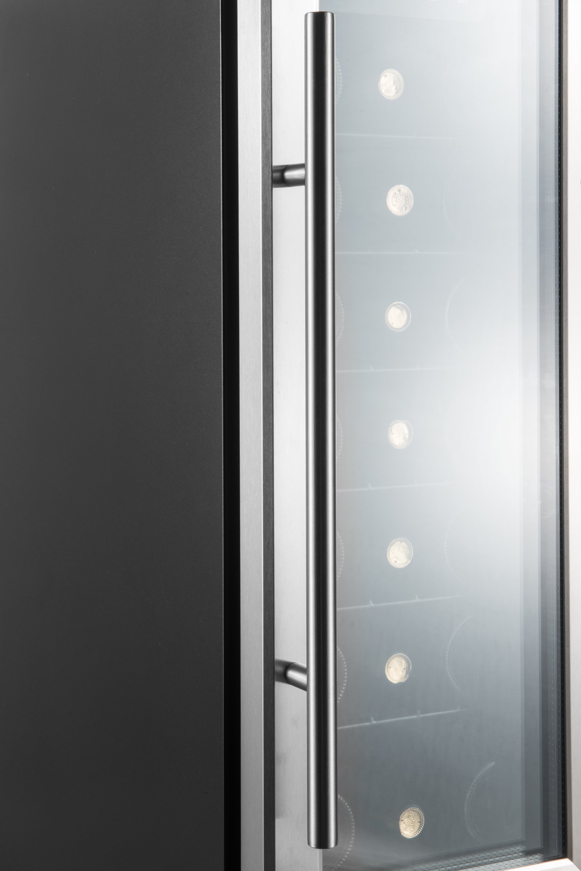 This under-counter wine cooler stores up to 21 standard wine bottles. Elegant stainless steel trimmed and dual paned glass door adds sophistication to any kitchen or bar setting. Digital panel with adjustable temperature between 41°F to 68°F. Front ventilation allows under-counter application.