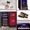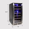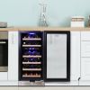 Designed for Built-In or Freestanding Use: 15-inch width and versatile front venting design allows for under-counter installation or freestanding use; 33" (84 cm) height fits below most standard countertops Dual Zone Cooling: Separately controlled temperature zones with digital touch screen controls let you customize the ideal temperature for storing up to 10 standard Bordeaux bottles in the upper section and 18 in the lower Built-In Door Lock: Child-safe lock prevents unauthorized access to contents and temperature controls; suitable for either home or commercial restaurant use Reliable Compressor Technology: A high-performance compressor cooling system with advanced temperature management and range of 40-65°F (5-18°C) keeps your favorite red, white, and sparkling wines chilled and ready to serve Premium Materials: Constructed of elegant, high-quality materials including removable beechwood bottle racks, UV protective double-pane glass, and stainless steel door frame and handles