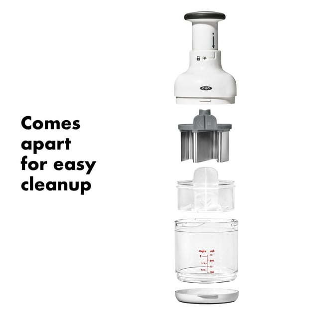 No matter how fast you are with a chef's knife, the is faster. And safer. It has a sharp, stainless steel blade that rotates with every single press of the knob, ensuring uniform pieces. In a flash, it can dice tomatoes for a salsa, pulverize nuts for a batch of brownies, and prep a stir fry. It's comfortable and easy to use, and the large catcher cup has convenient measurement markings. The whole thing comes apart for cleanup and is dishwasher safe.