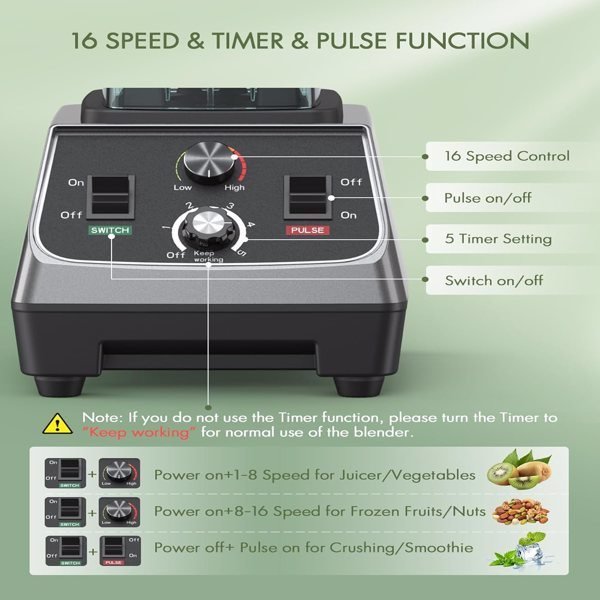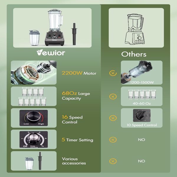 About this item[2200W High Power Blenders for Kitchen]Vewior blender for shakes and smoothies boasts a robust powerful 2200W motor capable of reaching speeds of up to 35000 RPM/min, making it outperform other smoothie blenders when it comes to crushing ice with greater speed and efficiency. It features an enhanced food-grade 6-leaf sharp blade specifically engineered for effortless ice crushing, making it an ideal choice for creating smoothies and frozen drinks.[XL Capacity Countertop Blender]The blender for shakes and smoothies includes a 68-ounce container crafted from tritan material with a capacity to accommodate 9 cups of liquid. It's a versatile blenders for kitchen that's ideal for both family meals and entertaining, capable of meeting the demands of commercial, cafe, or restaurant use. Additionally, it features a 27-ounce on-the-go cup with spout lids making it a convenient choice for enjoying nutrient-rich smoothies while you're out and about.[Variable Speed & Pulse Function] The blenders for kitchen i is furnished with 16 adjustable speed controls and pulse options that you can select on the fly, catering to your specific preference for food texture. This grants you full authority over the consistency of your beverage, ensuring that every food texture is flawless. Bid farewell to unblended fragments, chewy lumps, and grainy bits forever, courtesy of the VEWIOR blender designed for shakes and smoothies.[Multi-use Professional Blender] Our blenders for kitchen have the potential to substitute for as many as 8 different appliances: crush, blend, chop, grind, process, puree, or liquefy. The perfect blender for shakes and smoothies, frozen desserts, soups, nuts, sauces, hummus, dips, juice, and salsas. They provide a multitude of functions, ready to fulfill your diverse requirements.[Self-cleaning Countertop Blender] By simply adding a small amount of dish soap and warm water, your VEWIOR blenders for kitchen designed for commercial use can autonomously complete the cleaning process within a span of 30 to 60 seconds. The pitcher, to-go cups, and tamper are uncomplicated to clean and can be safely placed in the dishwasher.