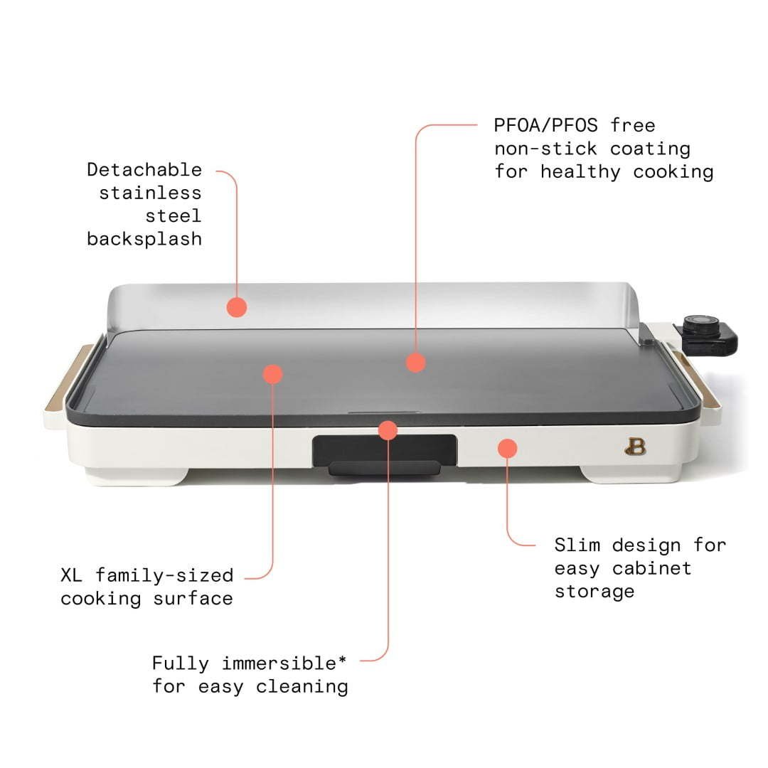 12" x 22" Extra Large Griddle, White Icing by Drew Barrymore XL family-sized cooking surface makes up to 15 pancakes or eggs at once to feed the entire family PFOA/PFOS free non-stick coating Slim design for easy cabinet storage Detachable stainless steel backsplash to keep your counter clean while cooking Removable heat control with easy-to-use dial ranging from 200°F – 400°F Powerful 1500-watt heating system delivers optimal and even heat distribution Cool-touch handles for convenient handling Removable drip tray collects unwanted fats and oils from food Available exclusively at Walmart
